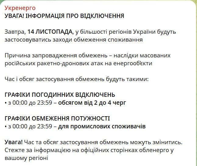 18:27 Отключения света завтра будут в большинстве регионов – круглосуточно в объеме от 2 до 4 очередей, сообщает Укрэнерго.