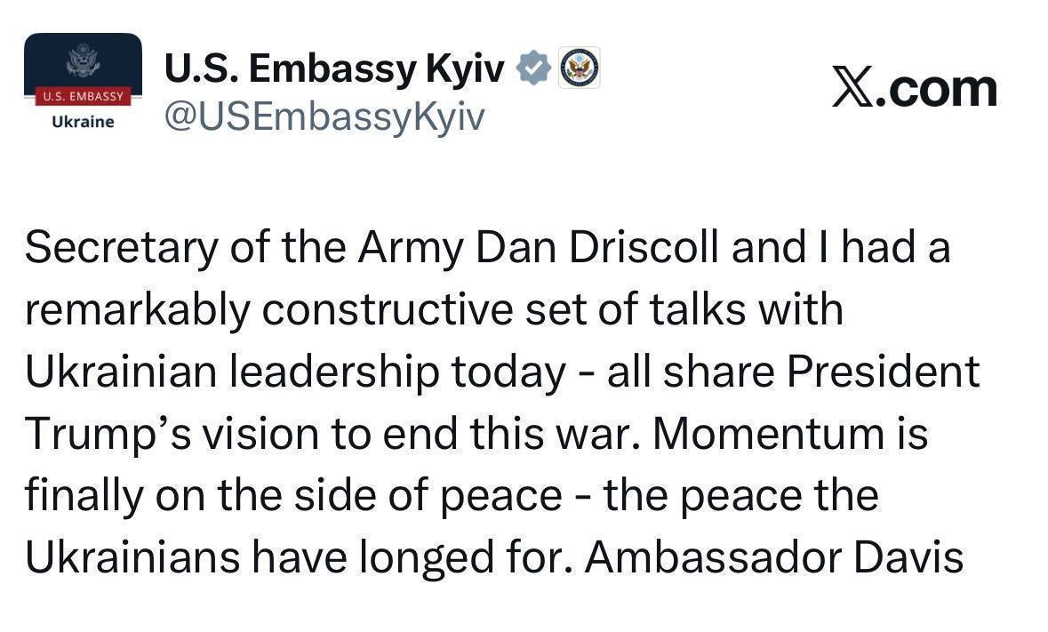 "Сегодня во время встречи с министром Сухопутных войск США Дэниэлом Дрисколлом говорили о вариантах достижения настоящего мира, этапности работы и форматах диалога, а также новых импульсах для дипломатии. Наши команды Украины и США будут работать над пунктами плана для окончания войны. Мы готовы к конструктивной, честной и оперативной работе", – заявил Зеленский.
