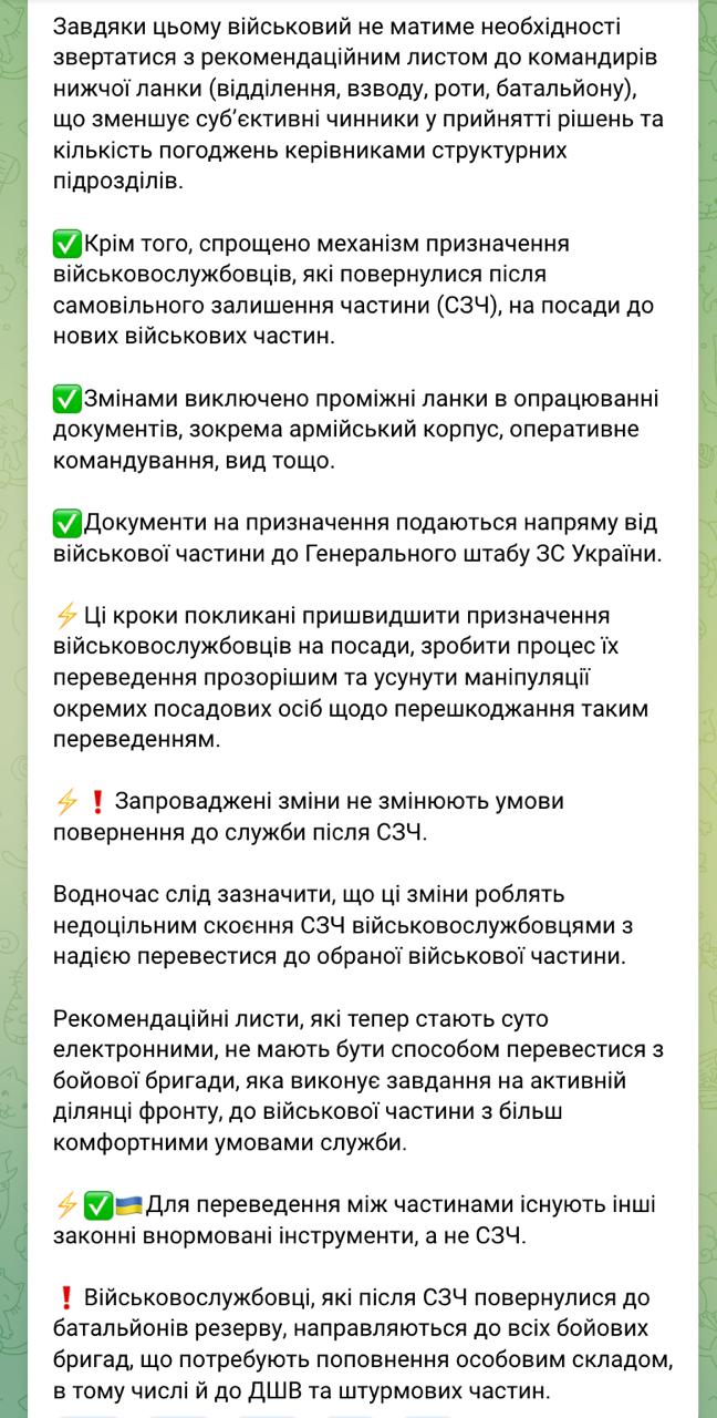 В частности, при назначении военнослужащих, вернувшихся из СЗЧ, на должности в новые воинские части, исключены промежуточные звенья в проработке документов, в частности армейский корпус, оперативное командование и остальные. Документы на назначение подаются напрямую от воинской части в Генштаб.