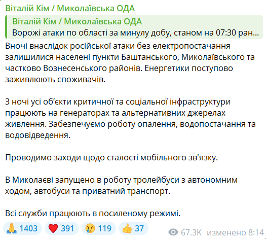 Глава Николаевской ОГА Виталий Ким сообщил, что в Николаеве после ночных ударов по области возникли проблемы с мобильной связью и электротранспортом. На улицы вышли троллейбусы с автономным ходом.