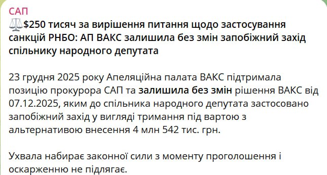 Апелляционная палата ВАКС оставила без изменений решение Высшего антикоррупционного суда о мере пресечения для "сообщника" народного депутата Анны Скороход в виде содержания под стражей с альтернативой внесения залога в 4 млн 542 тысяч грн.