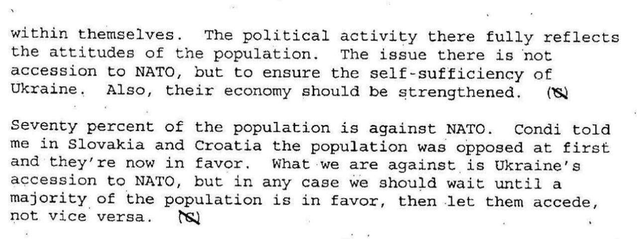 Отдельно он ссылался на общественное мнение внутри Украины: "НАТО воспринимается значительной частью украинского населения как враждебная организация" и "70% населения выступают против НАТО". При этом он призывал "в любом случае дождаться, пока большинство населения выскажется за это, а затем позволить им вступить, а не наоборот".