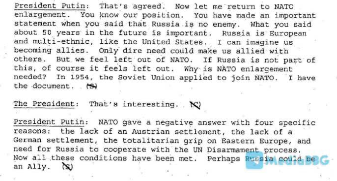 Кроме того, в стенограммах 2001 года зафиксировано, что Путин допускал возможность сближения России с НАТО. Он заявлял, что РФ "чувствует себя исключённой" из-за расширения Альянса, напоминал о заявке СССР на вступление в НАТО в 1954 году и утверждал, что причины отказа того времени больше не актуальны.
