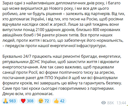 "Сейчас одни из самых активных дипломатических дней года и многое может решиться до Нового года, и мы все для этого делаем, но будут ли решения – зависит от партнеров", - написал Зеленский.