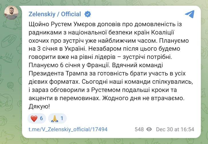 17.23 Зеленский пишет, что 3 января в Киеве состоится встреча советников по нацбезопасности в формате коалиции желающих, после чего планируется встреча на уровне лидеров, предварительно 6 января во Франции.