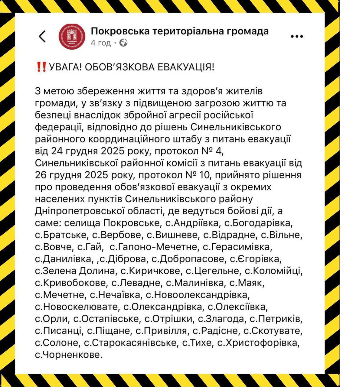 15.01 В Днепропетровской области объявили об обязательной эвакуации более 40 населенных пунктов в Синельниковском районе, сообщает Покровская община.