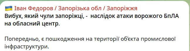 18.10 Запорожье подверглось атаке БпЛА, сообщил глава ОВА Федоров.