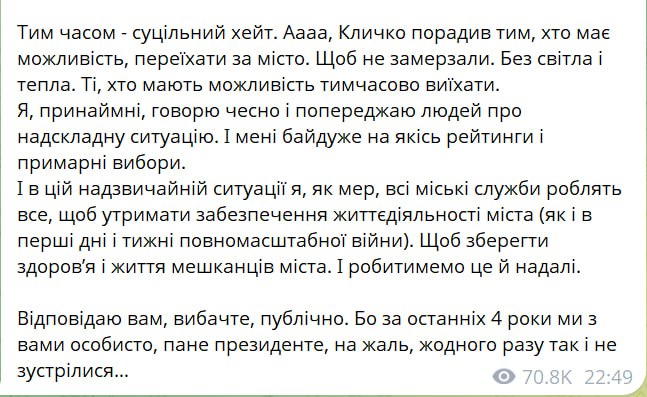 "А тем временем - сплошной хейт. Аааа, Кличко посоветовал тем, кто имеет возможность, переехать за город. Чтобы не замерзать. Без света и тепла. Тем, кто имеет возможность временно уехать. Я, по крайней мере, говорю честно и предупреждаю людей о чрезвычайно сложной ситуации. И мне наплевать на какие-то рейтинги и призрачные выборы", - написал мэр, намекая на то, что Банковая готовится к выборам.