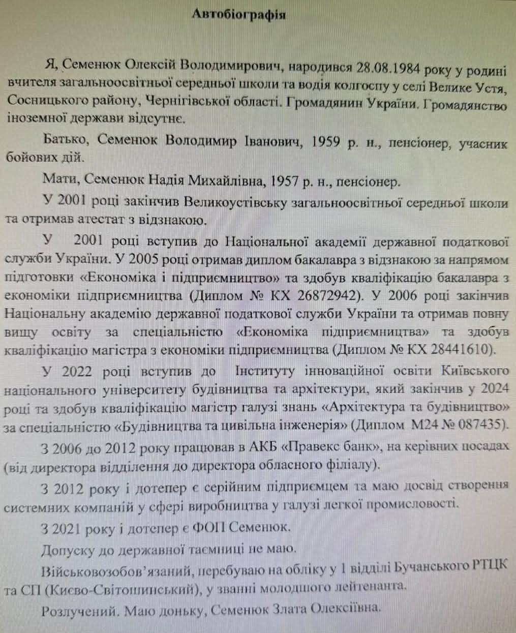 Алексей Семенюк родился в 1984 году в Черниговской области. По образованию экономист и магистр в сфере экономики предпринимательства, позже получил второе магистерское образование в области строительства и гражданской инженерии. Учился с отличием.