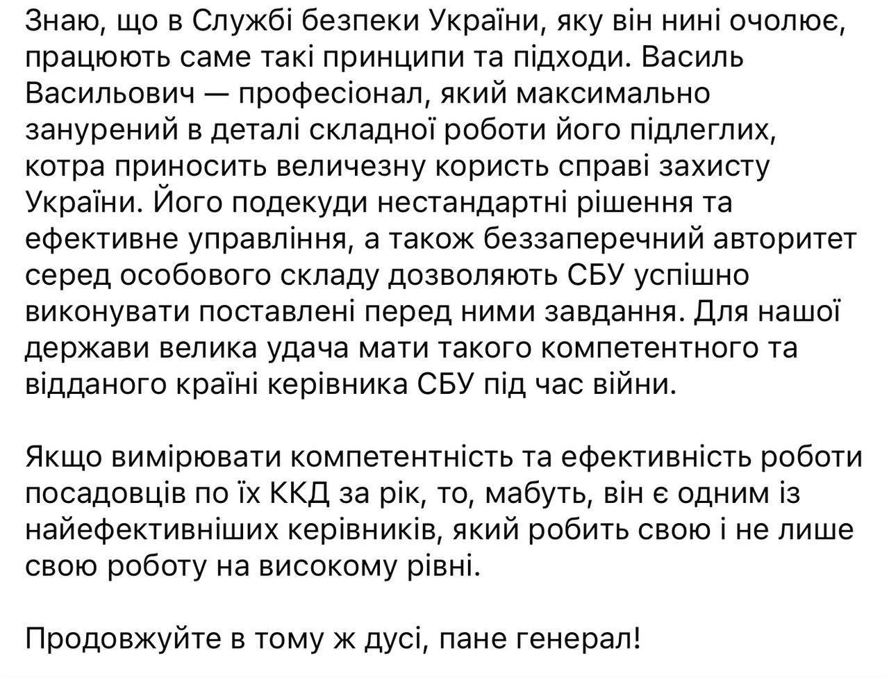 "Малюк - именно там, где должен быть: СБУ под его руководством оказывает ощутимое влияние на устойчивость нашей обороны. Результаты этой работы ощутимы как на поле боя, так и в тылу. Кроме того, своей личной безопасностью я также обязан Василию Малюку и его команде", - заявил Драпатый.