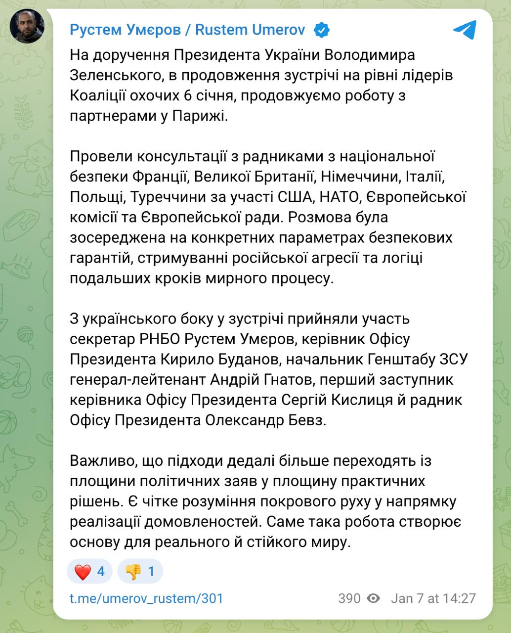14:38 Переговоры с американцами в Париже переходят к этапу практических решений, заявил Умеров.