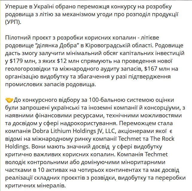 По словам Свириденко, победителем стала компания Dobra Lithium Holdings JV, LLC, акционерами которой являются компании Techmet и The Rock Holdings.