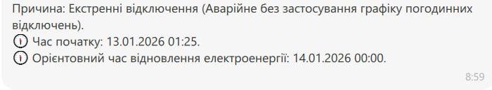 P.S. После публикации этой информации в телеграмм-каналах, ДТЭК прислал новую информацию, что отключения будут до 7 утра 14 января.