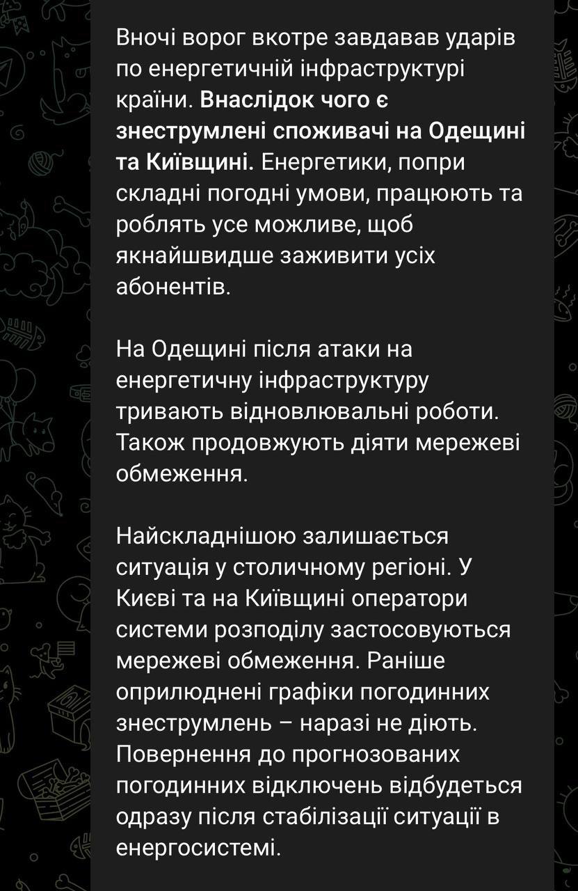 В Минэнерго также заявили, что после сегодняшних обстрелов были обесточены потребители в Одесской и Киевской областях. В ряде регионов также действуют аварийные отключения.