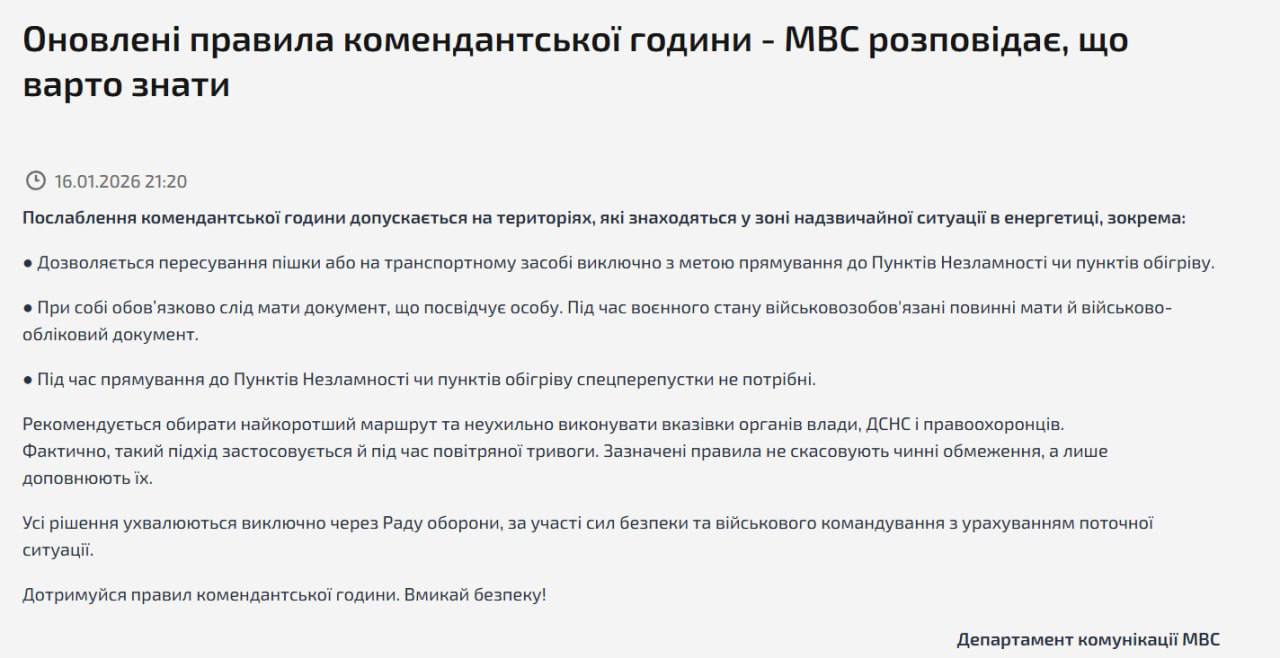 Все военнообязанные должны иметь при себе военно-учетный документ, если будут передвигаться во время комендантского часа. По информации ведомства, движение во время комендантского часа без специальных пропусков однако разрешается только в направлении "пунктов несокрушимости" или пунктов обогрева.