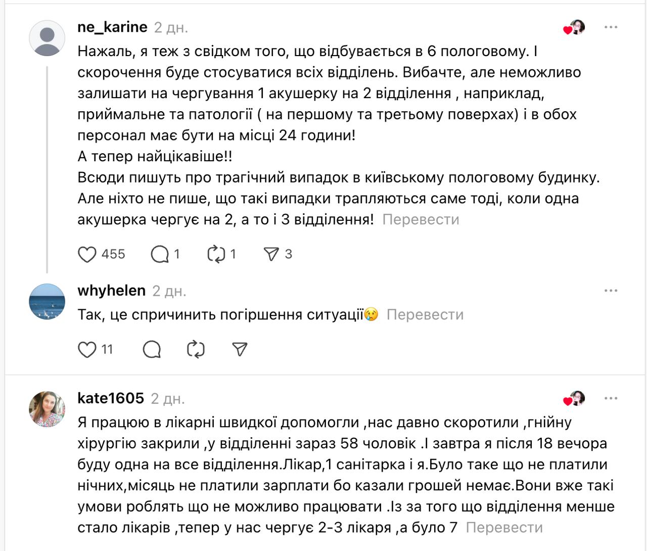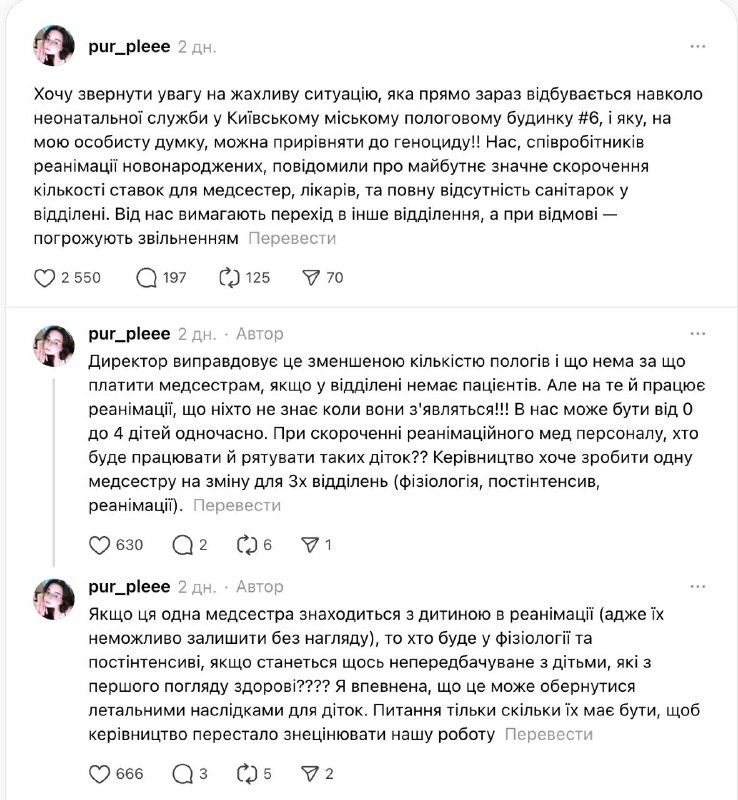 "Хочу обратить внимание на ужасную ситуацию, которая прямо сейчас происходит вокруг неонатальной службы в киевском городском роддоме №6... Нам, сотрудникам реанимации новорожденных, сообщили о предстоящем значительном сокращении количества ставок для медсестер, врачей и полном отсутствии санитарок в отделении. От нас требуют перейти в другое отделение, а при отказе угрожают увольнением. Директор оправдывает это уменьшенным количеством родов - мол, за что платить медсестрам, если в отделении нет пациентов. Но на то и работает реанимация, что никто не знает, когда они появятся! У нас может быть от 0 до 4 детей одновременно. При сокращении реанимационного медицинского персонала кто будет работать и спасать таких детей? Руководство хочет сделать одну медсестру в смену для трех отделений (физиология, постинтенсив, реанимация)", - сказано в публикации.