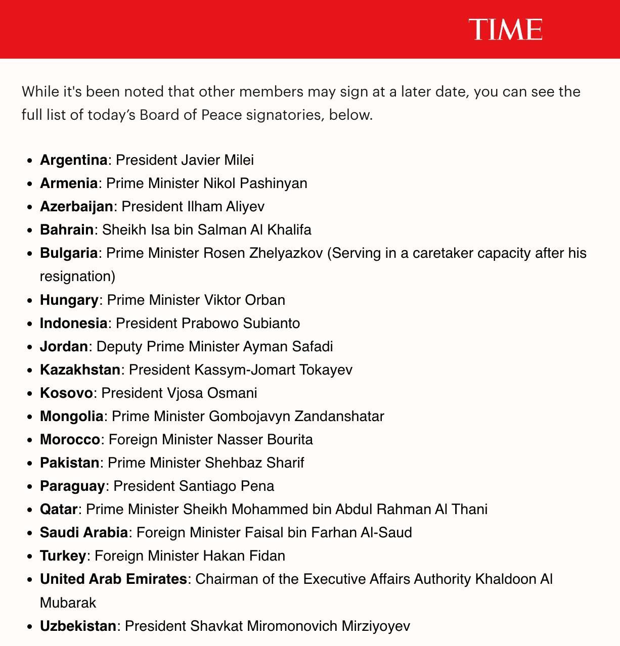 Таким образом, можно считать точно подтвержденным участие в Совете мира 21 страны. Под вопросом остаются Албания, Египет и Израиль, которые согласились на членство в организации.
