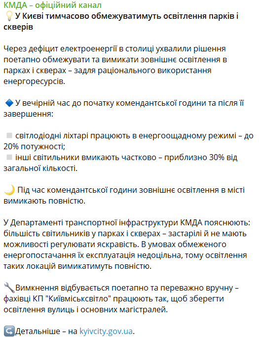 Из-за дефицита электроэнергии в Киеве будут поэтапно ограничивать и выключать наружное освещение в парках и скверах. Это сделано для рационального использования энергоресурсов.