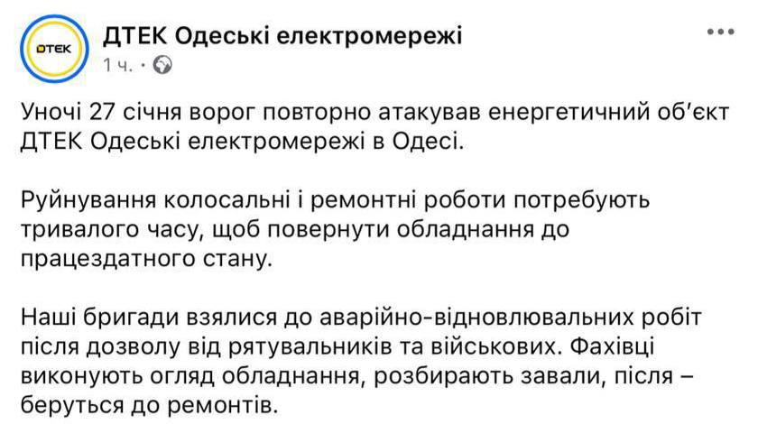 10.31 В Одессе ночью был повторный прилет по объекту энергетики, "разрушения колоссальные", ремонт займет длительное время, сообщает ДТЭК.