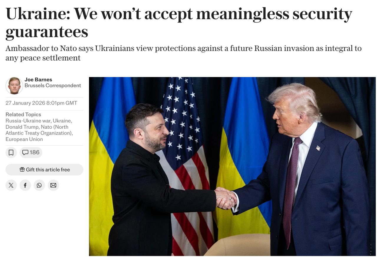 То есть в целом сейчас в европейских СМИ идет кампания с призывами к украинским властям не идти на уступки в переговорах (в первую очередь по Донбассу) и не верить обещаниям Трампа дать гарантии безопасности либо стоять на прежней, согласованной с частью европейских стран позиции, по которой мирное соглашение должно включать в себя ввод войск стран Европы в Украину под гарантии их военной поддержки со стороны США в случае нового нападения РФ.