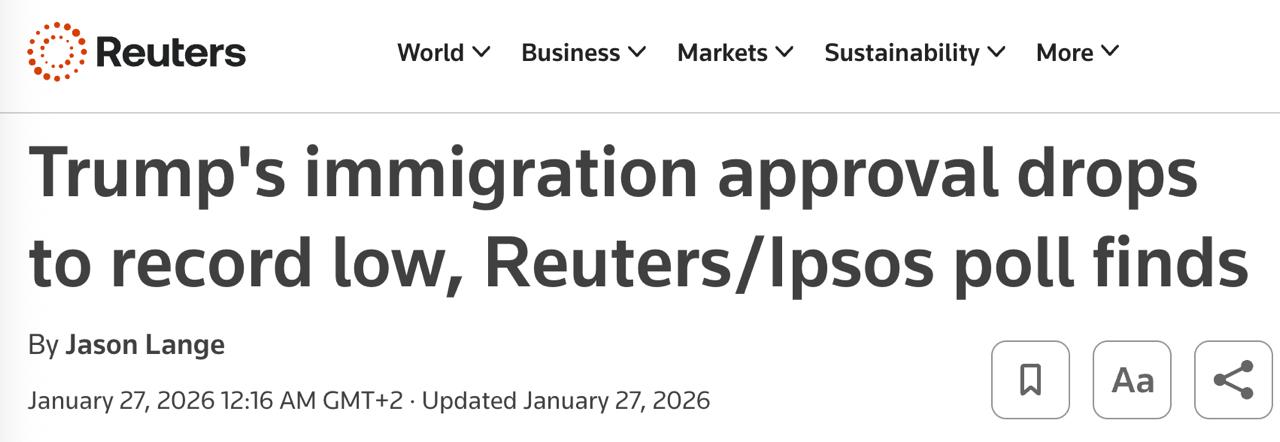 Еще 12-13 января рейтинг Трампа был 41% - до скандала из-за убийства сотрудником ICE мужчины и последовавших протестов в США.