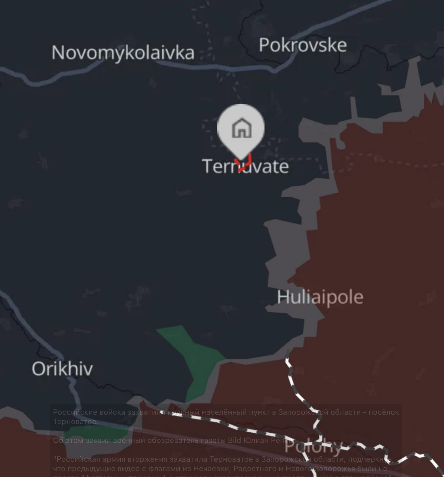 "Российская армия вторжения захватила Терноватое в Запорожской области, подчеркнув, что предыдущие видео с флагами из Нечаевки, Радостного и Нового Запорожья были не просто "флаговыми трюками", а отражали территориальные продвижения в этом районе", - написал Рёпке.