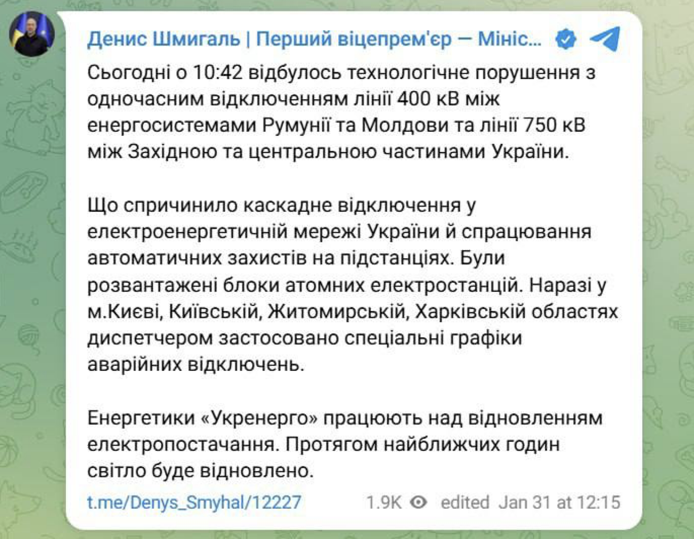 12:24 Первый официальный комментарий по сегодняшнему блекауту.