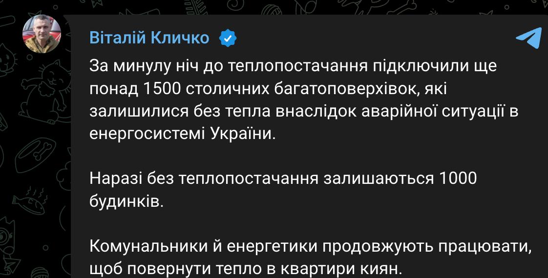 8:49 После вчерашней аварии в энергосистеме без тепла в Киеве остается 1000 домов, заявил Кличко.