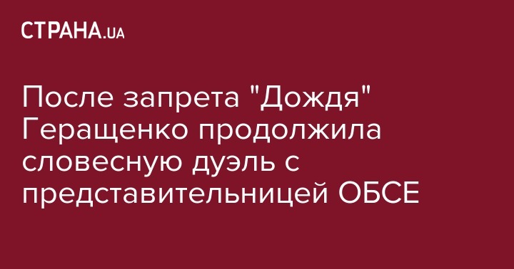 После волны возмущения, которую вызвал запрет на вещание телеканала "Дождь", первый вице-спикер парламента Ирина Геращенко заявила, что представители ОБСЕ и международные организации не реагируют на блокирование украинских каналов в России. На своей странице в Facebook Геращенко продолжила спор с представителем ОБСЕ по вопросам свободы прессы Дуней Миятович.