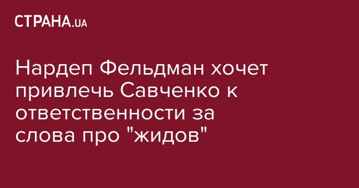 Депутат Верховной Рады Александр Фельдман ("Воля народа") возмущен высказывания его коллеги Надежды Савченко о "жидах" и обращается в Генеральную прокуратуру с заявлением о привлечении ее к ответственности по 161-й статье УК о нарушении равноправия граждан. Об этом он сообщил в Facebook.