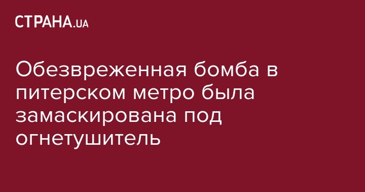 Бомба, которую нашли в Питере на станции метро "Площадь восстания" и обезвредили, была замаскирована под огнетушитель. Об этом сообщает "Интерфакс" со ссылкой на источник в правоохранительных органах.