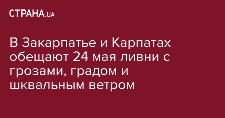 Согласно сообщению, 24 мая в западных областях будет облачно, дожди, грозы, днем местами град и шквалы 17-22 метров в секунду, а утром и днем местами сильный дождь, на Закарпатье и в Карпатах очень сильные дожди.