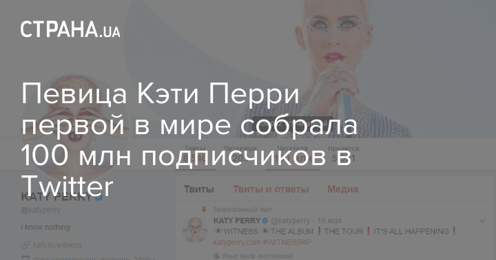 "Сегодня мы свидетели истории", – говорится в нем и отмечается, что певица первая собрала 100 млн фолловеров. Twitter в своем поздравлении использовал игру слов: "Свидетель" ("Witness") - название нового альбома Кэти Перри, который вышел в июне.