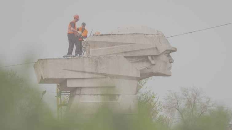 Представители коммунальных служб демонтируют коммунистический лозунг и орден Ленина. Возле самого постамента стоят строительные леса, прилегающую территорию огородили забором. Сегодня планируется исследовать конструкцию памятника изнутри. Верхняя часть головы памятника уже вскрыта.
