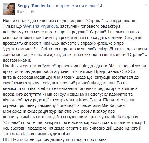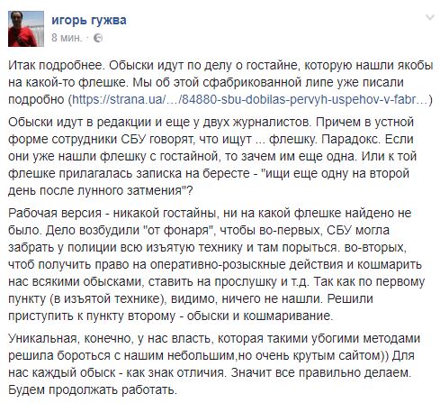"Обыски идут по делу о гостайне, которую нашли якобы на какой-то флешке. Мы об этой сфабрикованной липе уже писали подробно.