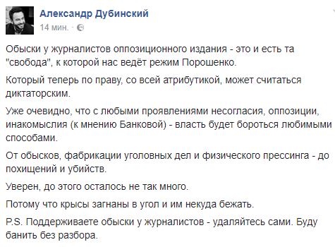 10:52 "Обыски у журналистов оппозиционного издания - это и есть та "свобода", к которой нас ведёт режим Порошенко. Который теперь по праву, со всей атрибутикой, может считаться диктаторским. Уже очевидно, что с любыми проявлениями несогласия, оппозиции, инакомыслия (к мнению Банковой) - власть будет бороться любимыми способами", - пишет у себя в Facebook известный тележурналист Александр Дубинский.