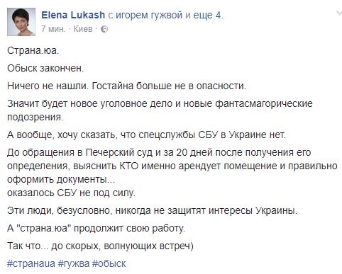 10:58 "Дело о "вымогательстве" приказало долго жить", - пишет адвокат "Страны" Елена Лукаш у себя в Facebook
