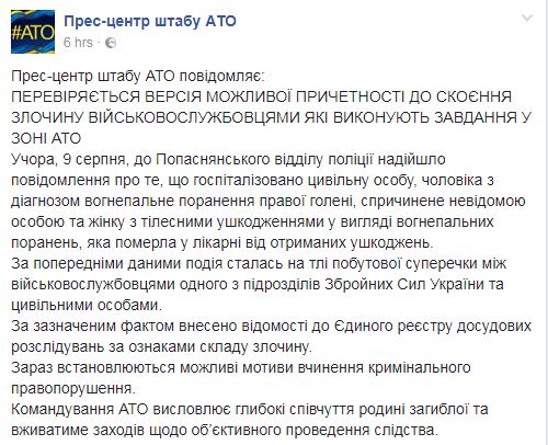"Командование АТО выражает глубокие соболезнования семье погибшей и примет меры по объективному проведению следствия", - добавили в сообщении.