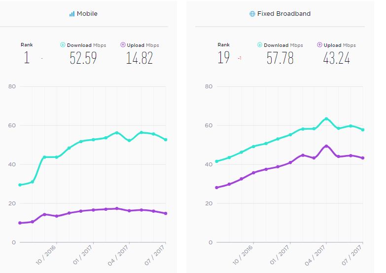 Лучшая ситуация с широкополосным интернетом. Здесь Украина занимает 39 место с 34,2Mbps при скачивании и 33,64Mbps при загрузке.