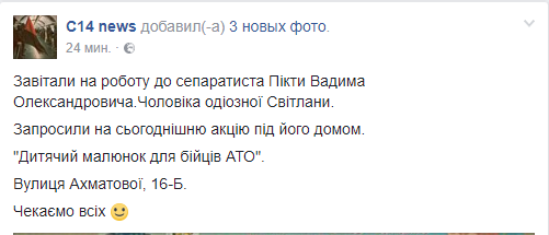 "Посетили работу сепаратиста Пикты Вадима Олександровича. Мужа одиозной Светланы. Пригласили на сегодняшнюю акцию под его домом. "Детский рисунок для бойцов АТО". Ждем всех :)", - пишут радикалы.