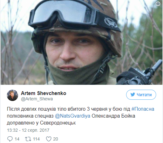 "После долгих поисков тело убитого 3 июня в бою под Попасной полковника спецназа Нацгвардии Александра Бойко доставлено в Северодонецк", - уточнил Артем Шевченко.