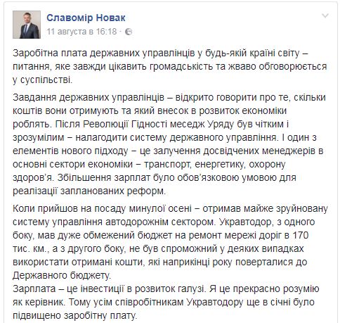 Глава государнственного агентства автомобильных дорог Украины ("Укравтодор") Славомир Новак рассказал, что его средняя заработная плата составляет 100 тысяч гривен.