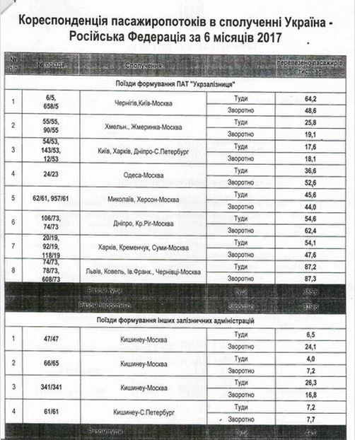 Лидером по перевозке пассажиров железнодорожным транспортом в Россию оказался поезд Львов-Москва. В первом полугодии 2017 года на нем границу пересекло 87 тысяч пассажиров.