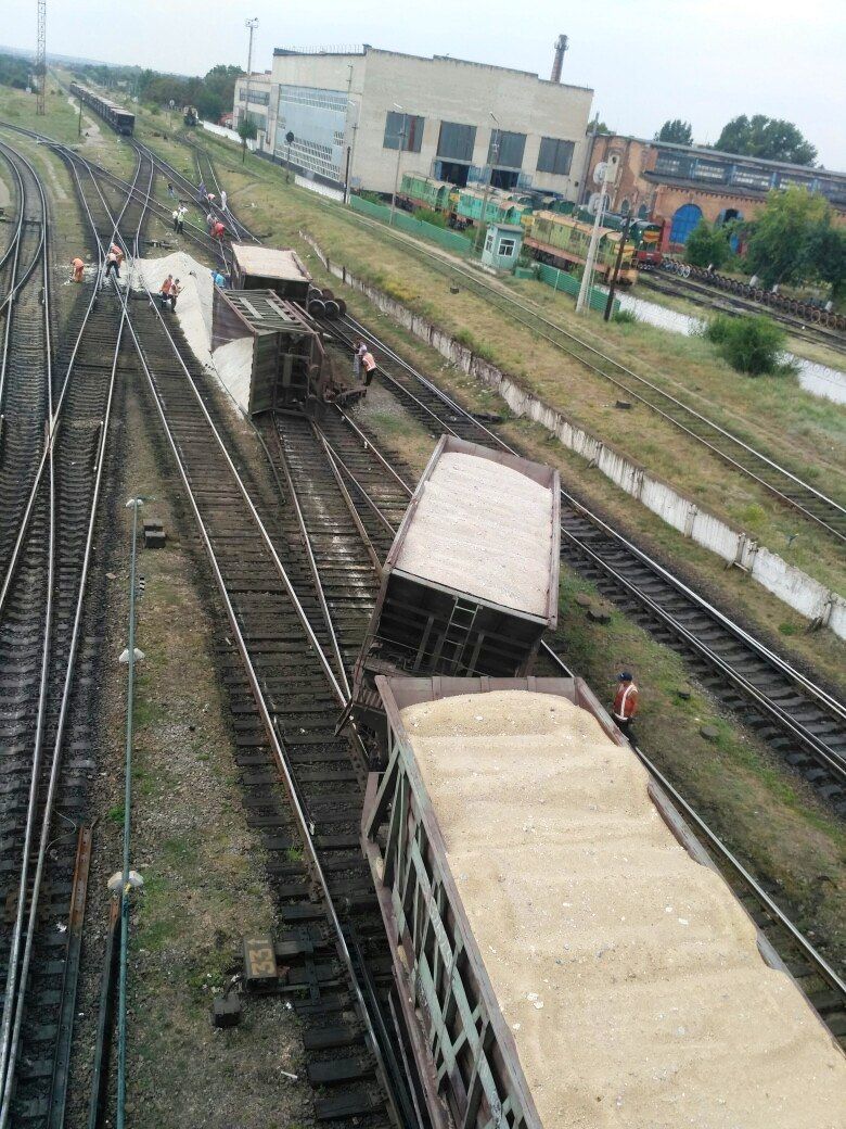 Появились фото, как на станции в Запорожской области перевернулся груженый вагон