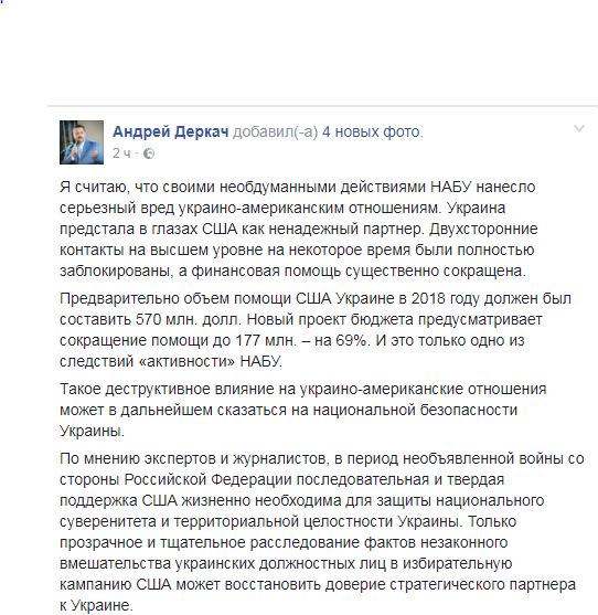 "Я считаю, что своими необдуманными действиями НАБУ нанесло серьезный вред украино-американским отношениям. Украина предстала в глазах США как ненадежный партнер. Двухсторонние контакты на высшем уровне на некоторое время были полностью заблокированы, а финансовая помощь существенно сокращена", - написал он.
