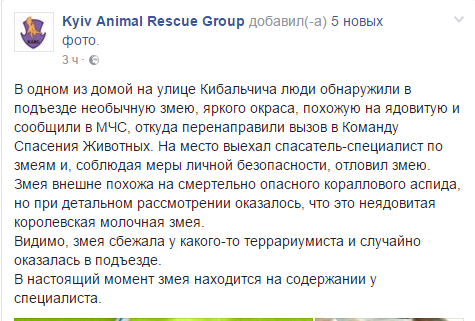 В подъезде дома в Днепровском районе Киева обнаружили змею. Об этом на своей странице в социальной сети Facebook сообщила Киевская команда спасения животных.