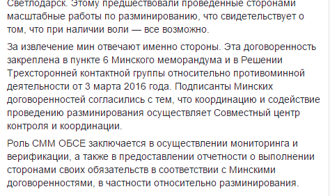 "Доступ наблюдателей СММ ОБСЕ в Пикузы и Счастье все еще ограничен из-за того, что стороны не изымают мины, которые сами же установили", - говорится в сообщении.