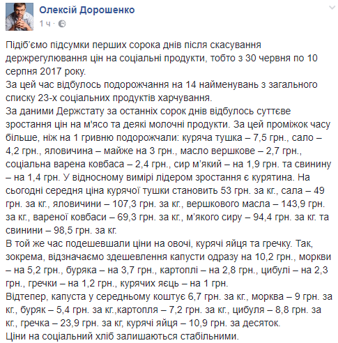 Генеральный директор Украинской ассоциации торговый сетей Алексей Дорошенко подвел итоги первых сорока дней после отмены госрегулирования цен на социальные продукты. Он написал в Facebook, что в Украине с 30 июня по 10 августа подорожало мясо и некоторые виды молочки, а вот овощи, яйца и гречка стали дешевле.