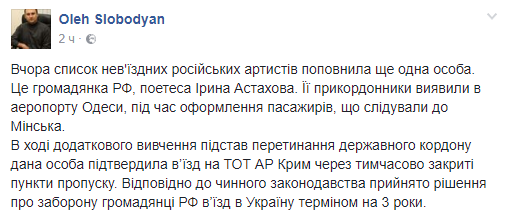 "Вчера список невъездных российских артистов пополнил еще один человек. Это гражданка РФ, поэтесса Ирина Астахова. Ее пограничники обнаружили в аэропорту Одессы, при оформлении пассажиров, следовавших в Минск", - написал он.