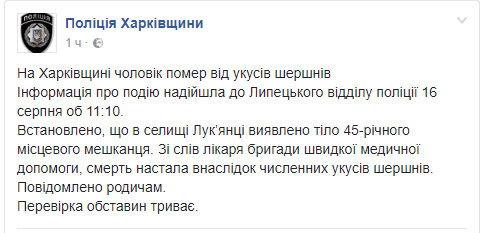 В поселке Лукьянцы Харьковской области 45-летний мужчина умер от укусов шершней. Об этом сообщает пресс-служба местной полиции.